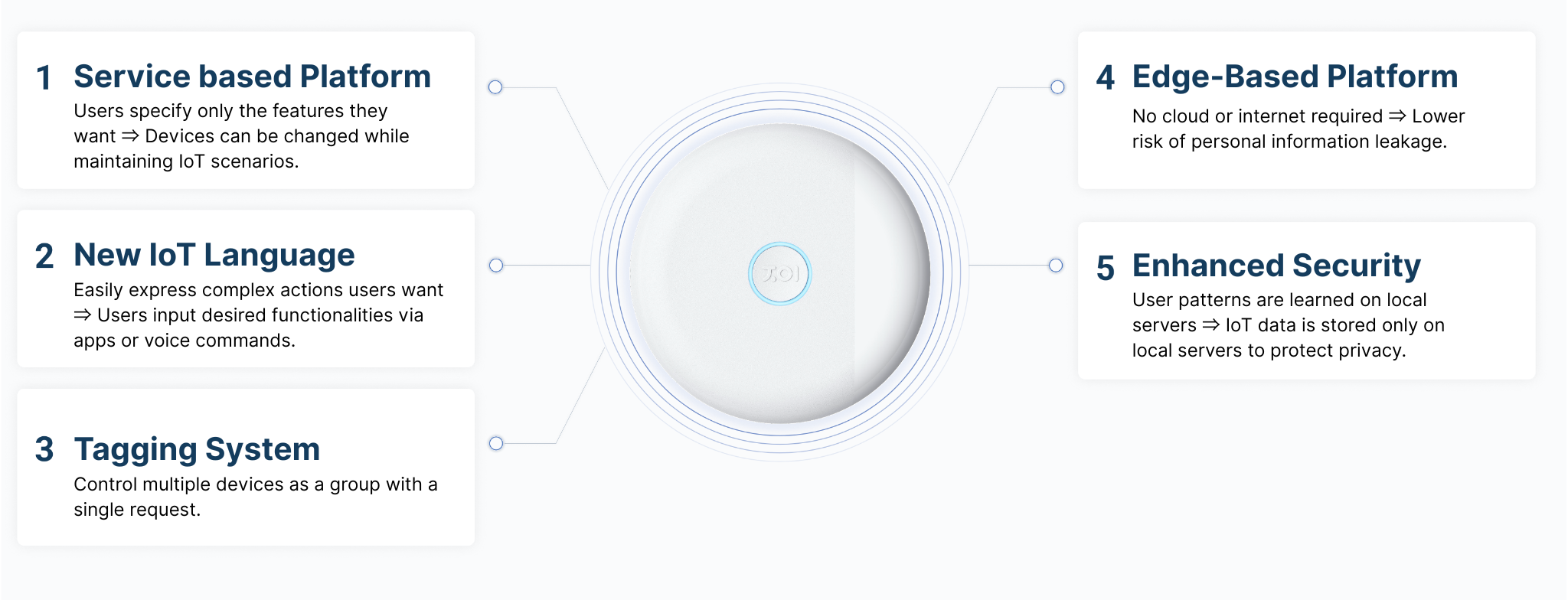 Unlike traditional IoT platforms, JOI uses Super Services to securely link IoT devices and robots across multiple layers. Each JOI hub processes data locally, ensuring immediate responsiveness, improved security, and smooth scalability without relying on cloud connections.